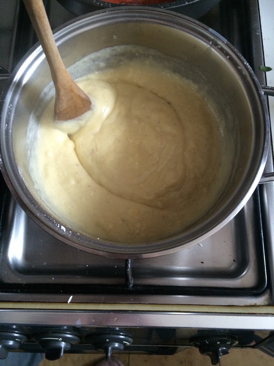 Una volta mischiati i due composti mettere la pentola su fuoco basso e girare con un mestolo di legno.