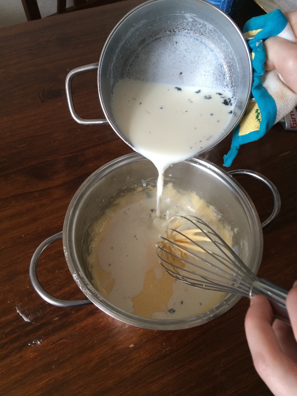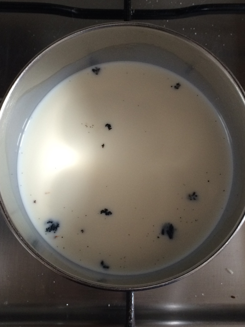 Mettere il latte e i semi di vaniglia in un pentolino e far cuocere a fuoco basso