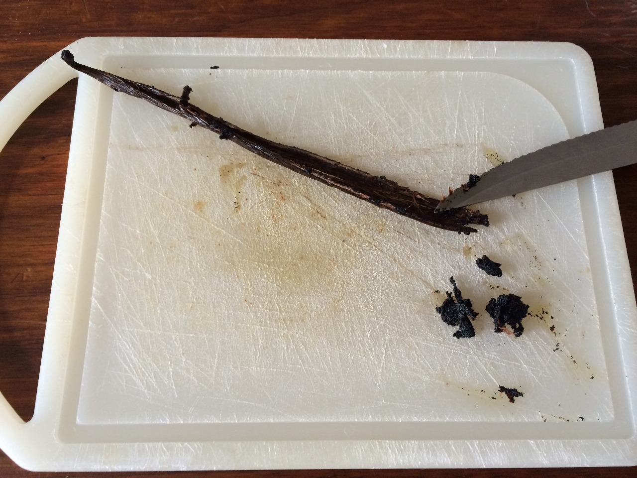 Tagliare la stecca di vaniglia a metà e aiutandosi con un coltello togliere i semi dall'interno.