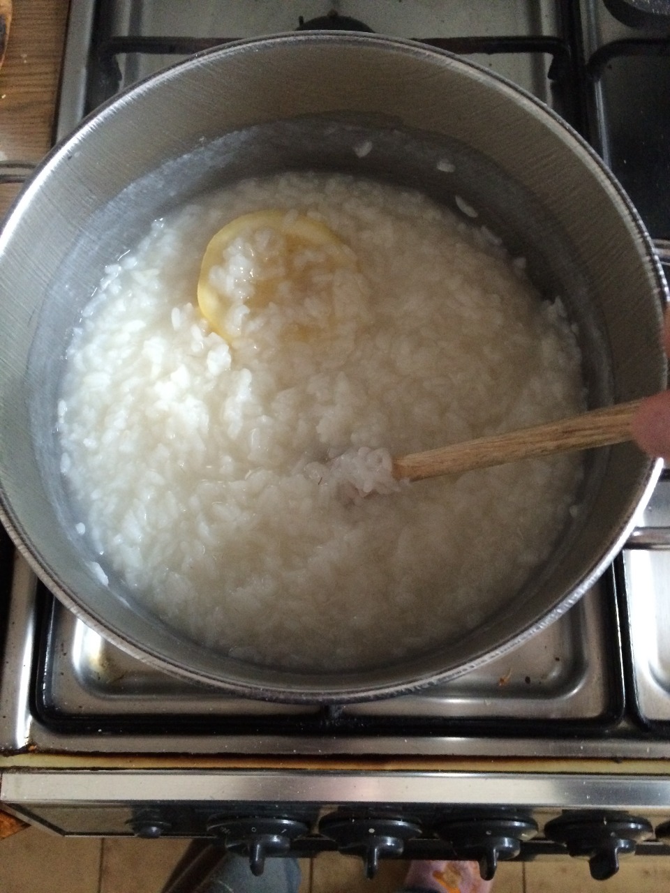 Poi aggiungere il riso,il sale, lo zucchero e il 1/2 limone (con la buccia).
